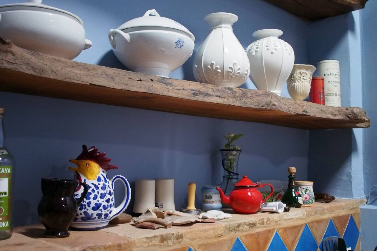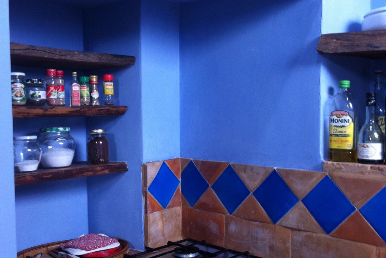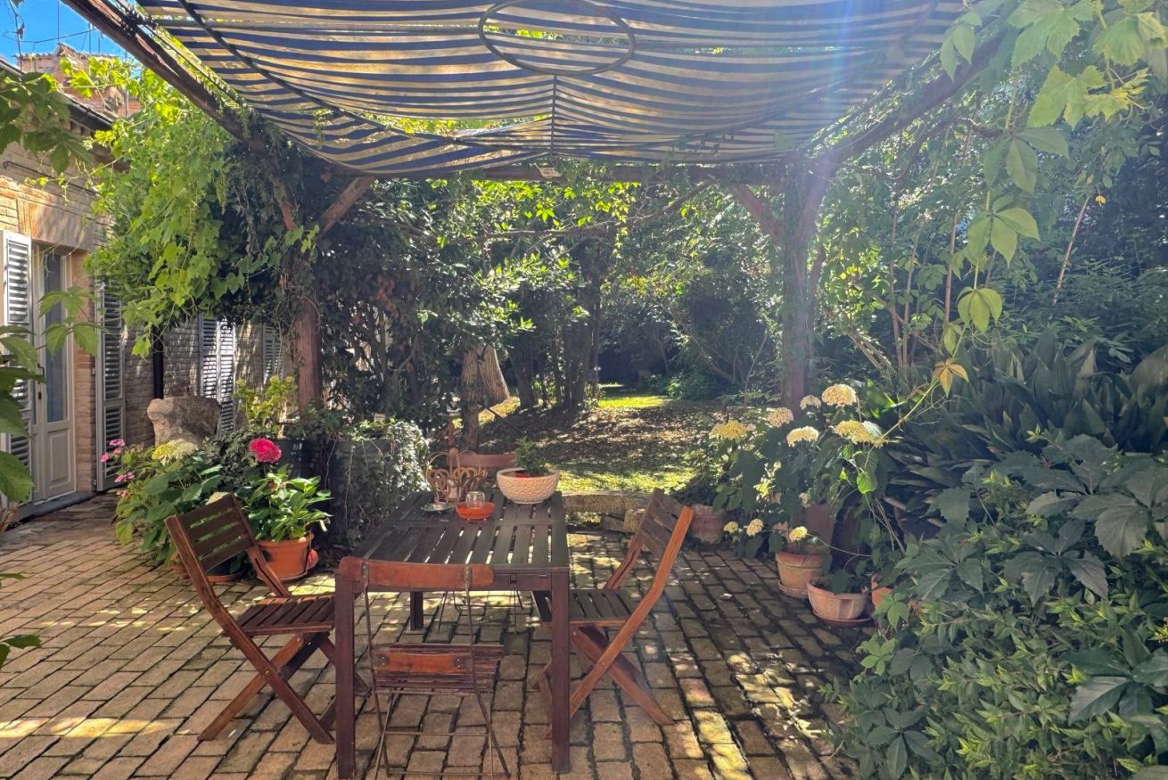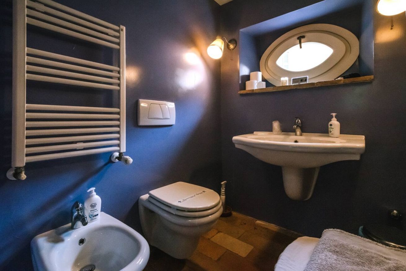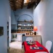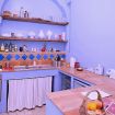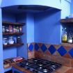 Una cucina che incanta: color indaco, con grande arco settecentesco e comoda zona pranzo. Fuori una splendida pergola a vostro uso esclusivo, nel grande giardino in comune con altri ospiti, ma con vostra zona di pertinenza.